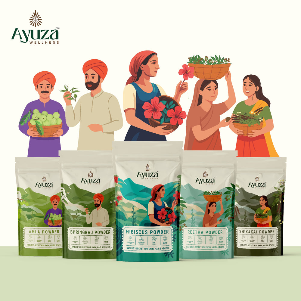 Experience the ancient secret of beautiful, healthy hair with Ayuza Wellness 5-in-1 Herbal Hair Care Combo. This powerful blend of Amla, Reetha, Hibiscus, Bhringraj, and Shikakai powders brings together the timeless benefits of Ayurveda to deeply nourish your scalp, strengthen your roots, and restore natural shine — all without a single chemical.